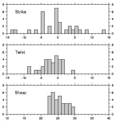 Figure 1 shows histograms of the strike, twist and shear found from an unconstrained GB analysis of the thirty-one realizations. The distributions of the GB parameters clear shows that shear and twist are more stable under decomposition than strike angle determination. The strike directions determined appear to be approximately normally distributed, although they ill define the regional strike.