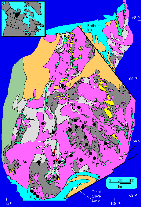 - Pell, J., 1995. NWT Kimberlite database; includes pipe locations, preliminary